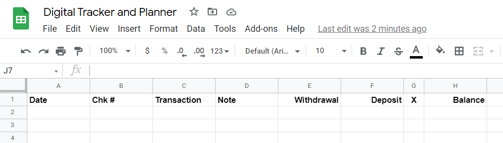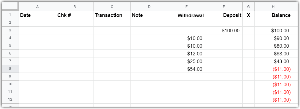 - Enter column headers: Date, Chk # (i.e., check number), Transaction, Note, Withdrawal, Deposit, X, Balance.