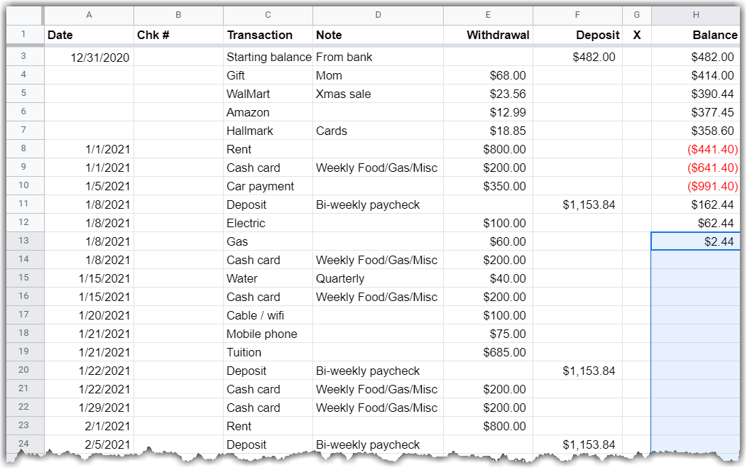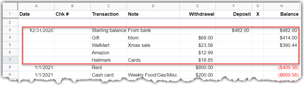 - Enter one month’s worth of information (as shown in figure 2 below), leaving a few lines at the top of the list for when you are ready to add the current balance and outstanding commitments not cashed. Don’t worry about leaving enough or too many. Rows can be inserted or deleted when you are ready.