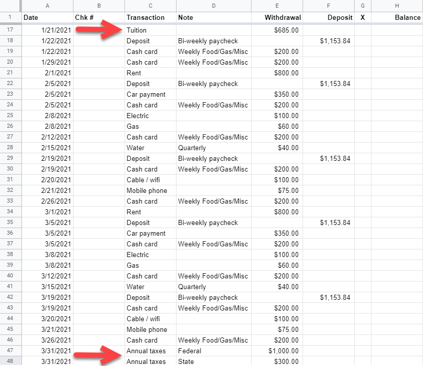 - School? – Okay. This makes sense for the tuition bill. Insert a row in the digital tracker and planner for the $685.00 deposit. That will offset the check for your tuition payment.