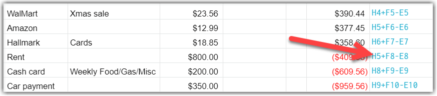 Your first thought might be to copy the formula from row 5 to the empty rows: 6 and 7. Let’s see why that won’t work. The image below shows the formulas from the balance column.