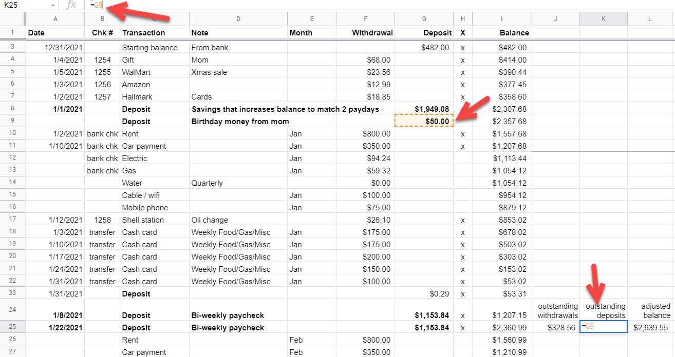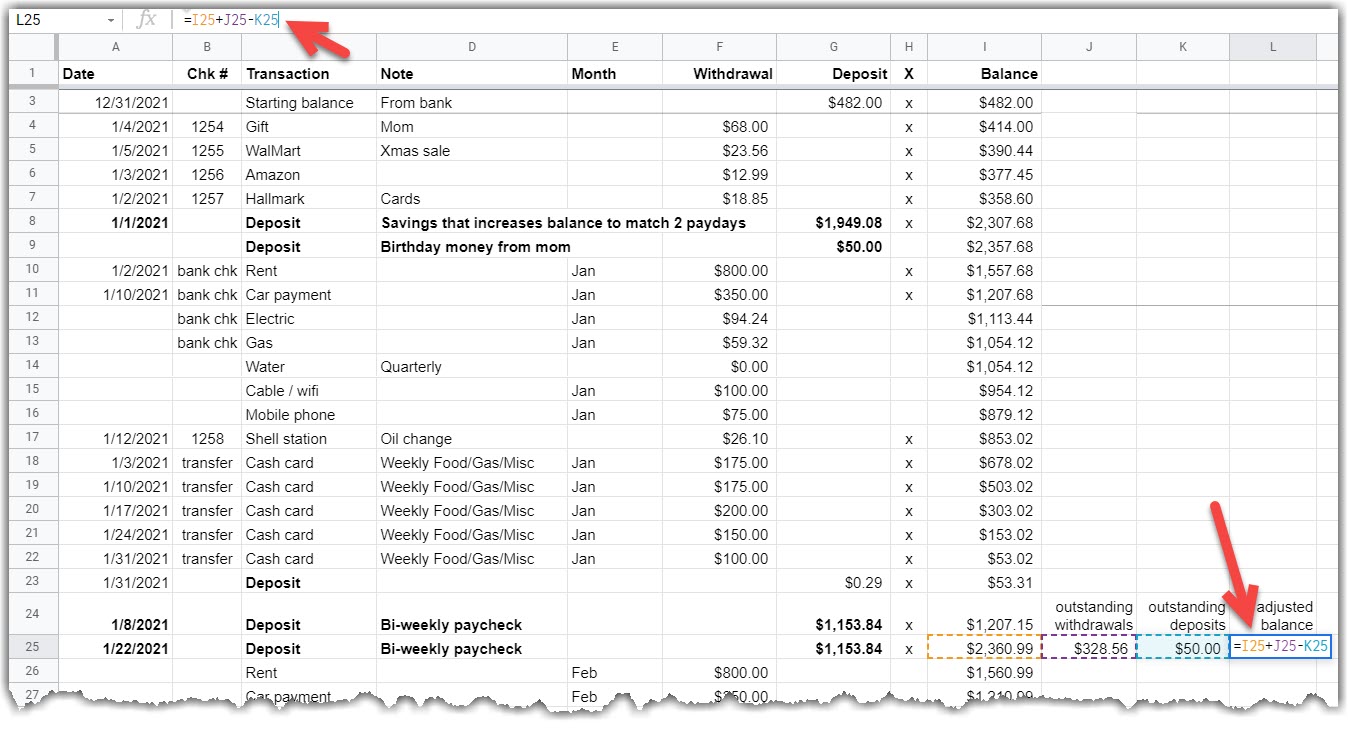 - Calculate the adjusted balance. The formula is always the same for this calculation: current balance plus outstanding withdrawals minus outstanding deposits. In this example, the formula looks like this: =I25+J25-K25 and is shown in figure 4.